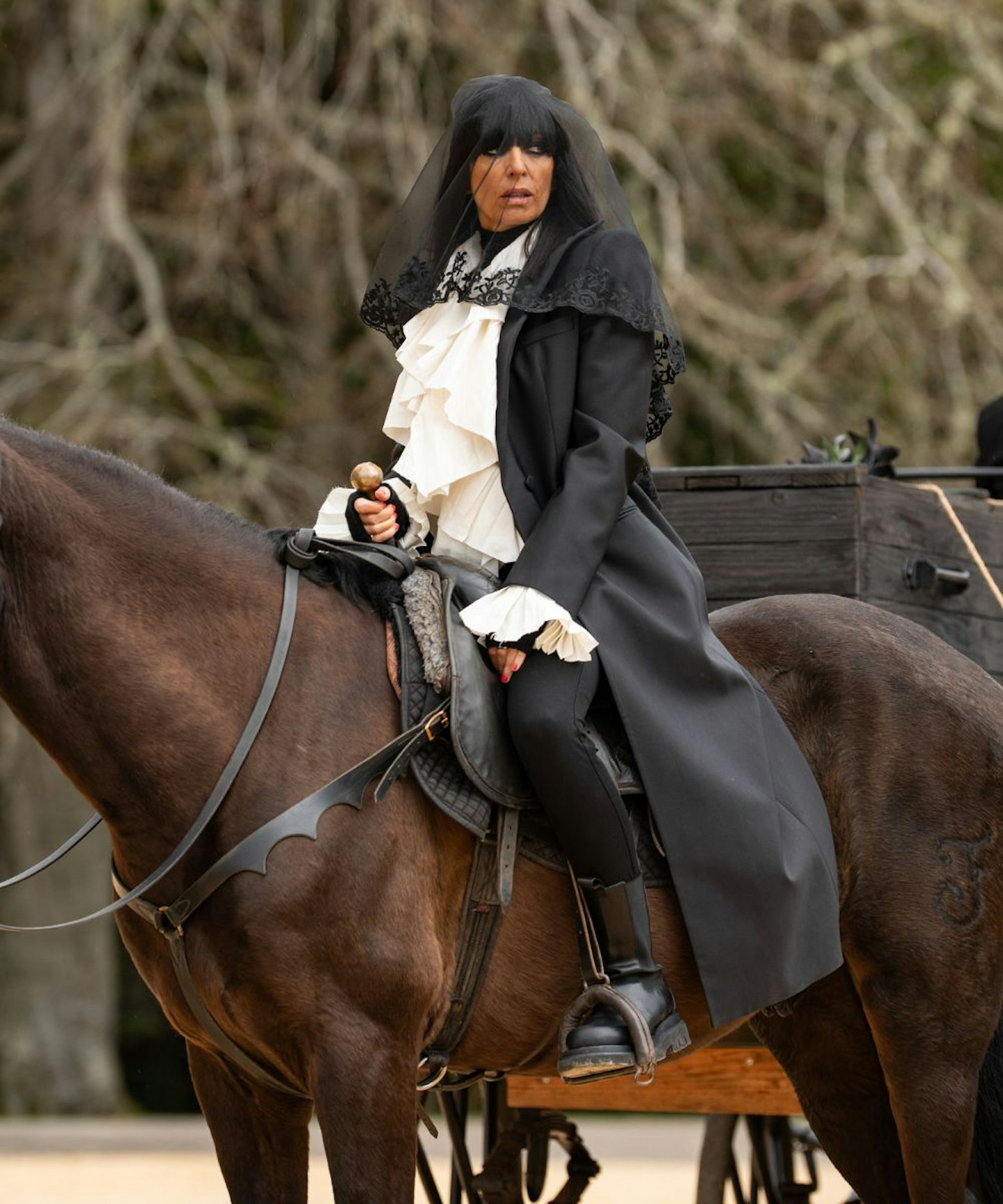 Episode 4 saw one of Winkleman’s best looks yet, as she brought her signature gothic glamour to the castle with a standout look. She wears a textured black Simone Rocha cardigan paired with a dramatic tulle skirt from the same designer (now unfortunately sold out). Of course, paired with her favourite Bottega Veneta boots.