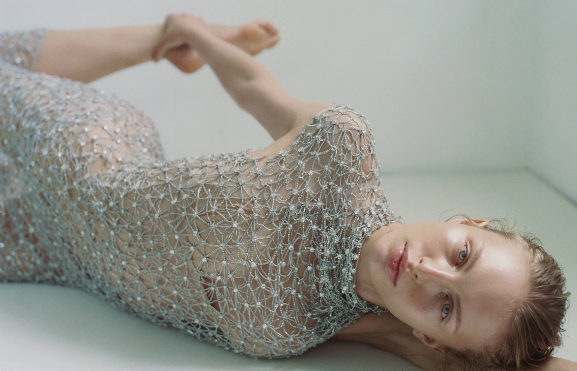 For this story, the Paris-based artist wanted to explore inner sensuality and nuanced ideas of head-to-toe beauty. “I thought about a woman in her skin, and how makeup not only enhances but becomes part of us,” says Pica. She combined a soft palette of sheer pastels with accents of strong color and reflective materials like gold leaf, fine glitter, and tiny crystals to highlight various parts of model Karolina Spakowski’s body and face. “Colors, textures, and shine travel into each other, so it feels like they are part of the skin, or at least that’s how I imagined it,” says Pica. “The whole thing is not too structured—there’s a bit of technique, but also a sense of freedom and experimentation.”
